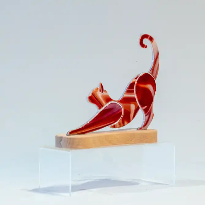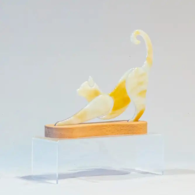 Deze strekkende kat op een houten voet is een strak en modern glaskunstwerk met een eigentijds ontwerp. Het kunstwerk past perfect in elke woning van een kattenliefhebber en vormt zowel in een modern als in een klassiek interieur een stijlvolle toevoeging.